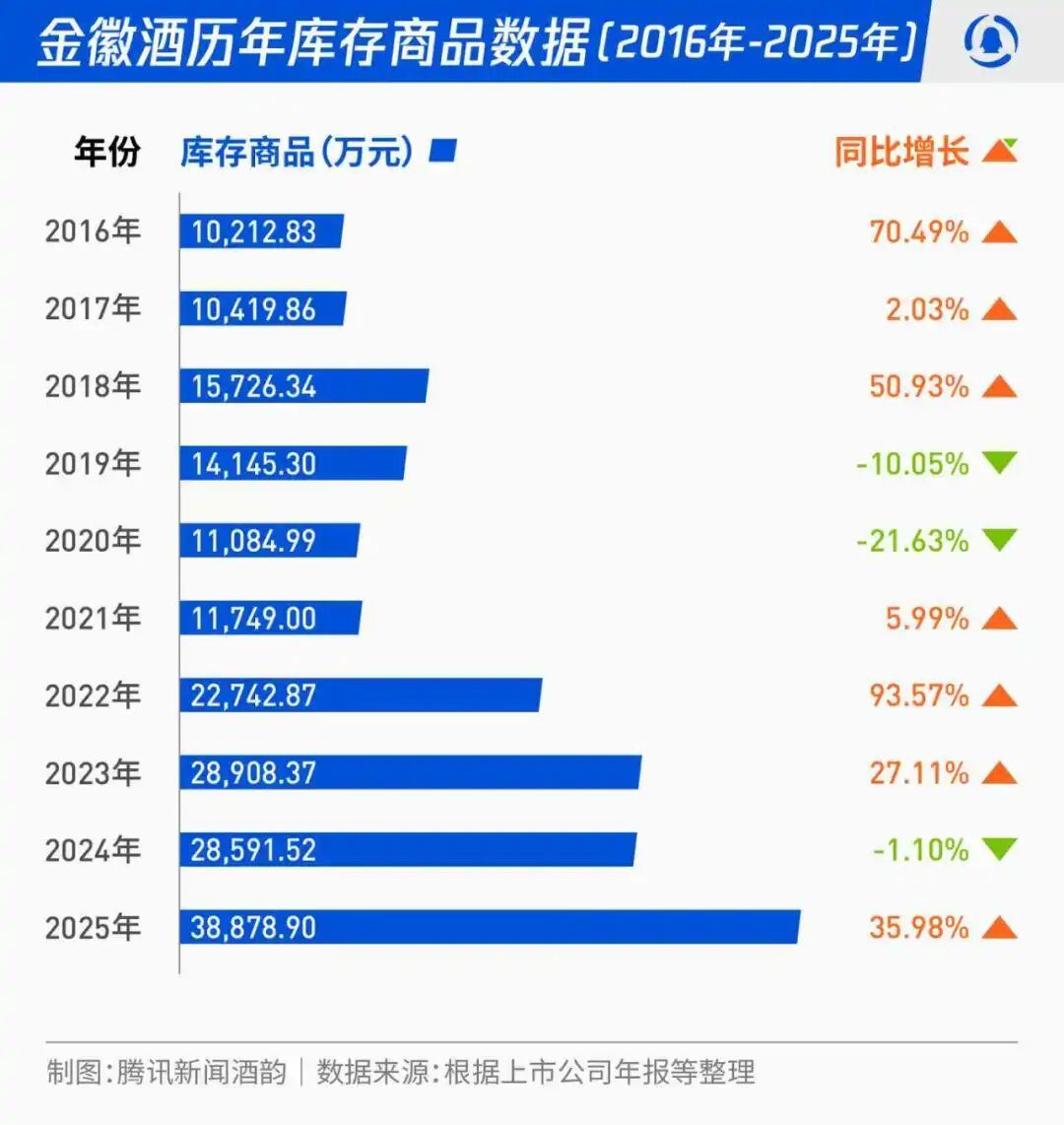 在白酒存货明细中,库存商品是酒企生产出还没卖掉的酒,最能反映酒企的动销情况。数据显示,金徽酒2025年库存商品同比大幅增长35.98%至3.89亿元,高企的库存意味着流动资金积压和市场去化困难。