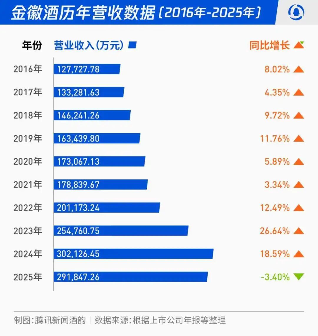 白酒市场深度调整期,金徽酒也深受影响。2025年全年实现营收29.18亿元,同比下降3.40%,这也是公司上市以来首次营收下滑。华泰证券分析认为,金徽酒营收低于此前预期主要因外部需求较弱。上市公司也表示,受白酒行业政策管控以及行业深度调整影响,导致销量下降。